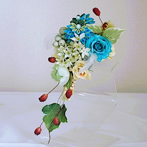 ローズもブルーローズ、淡いグリーンローズ、淡いイエローローズを使用。