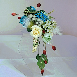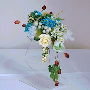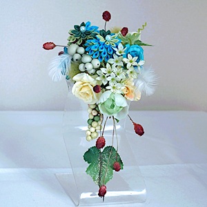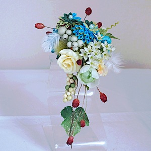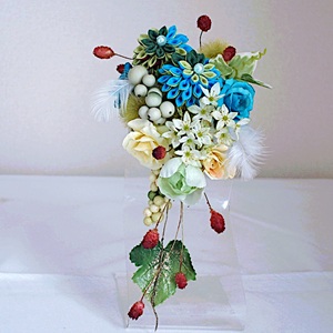 ふたつの二重剣つまみ細工をメインにブルーローズとたくさんの小花(ローズ、ベリー、ワレモコウ、ポンポンボール、フェザー)を組み入れました。
